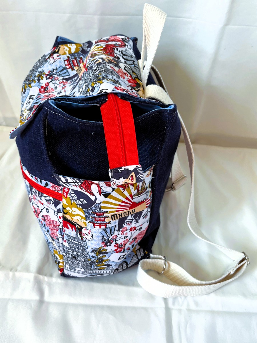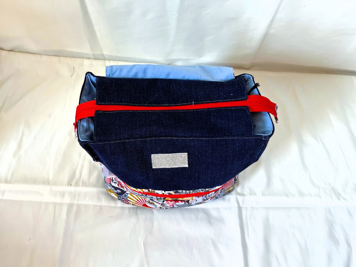 • Une grande poche qui se ferme par un zip et un scratch, puis une poche plus petite devant fermée par un zip (26 x 14 cm).